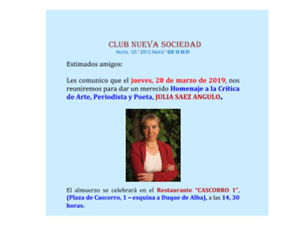El pasado día 28 de marzo de 2019 el club nueva sociedad le dio un homenaje a Julia y le concedió el premio Damaso Alonso. Podéis leer el artículos en los siguientes enlaces: